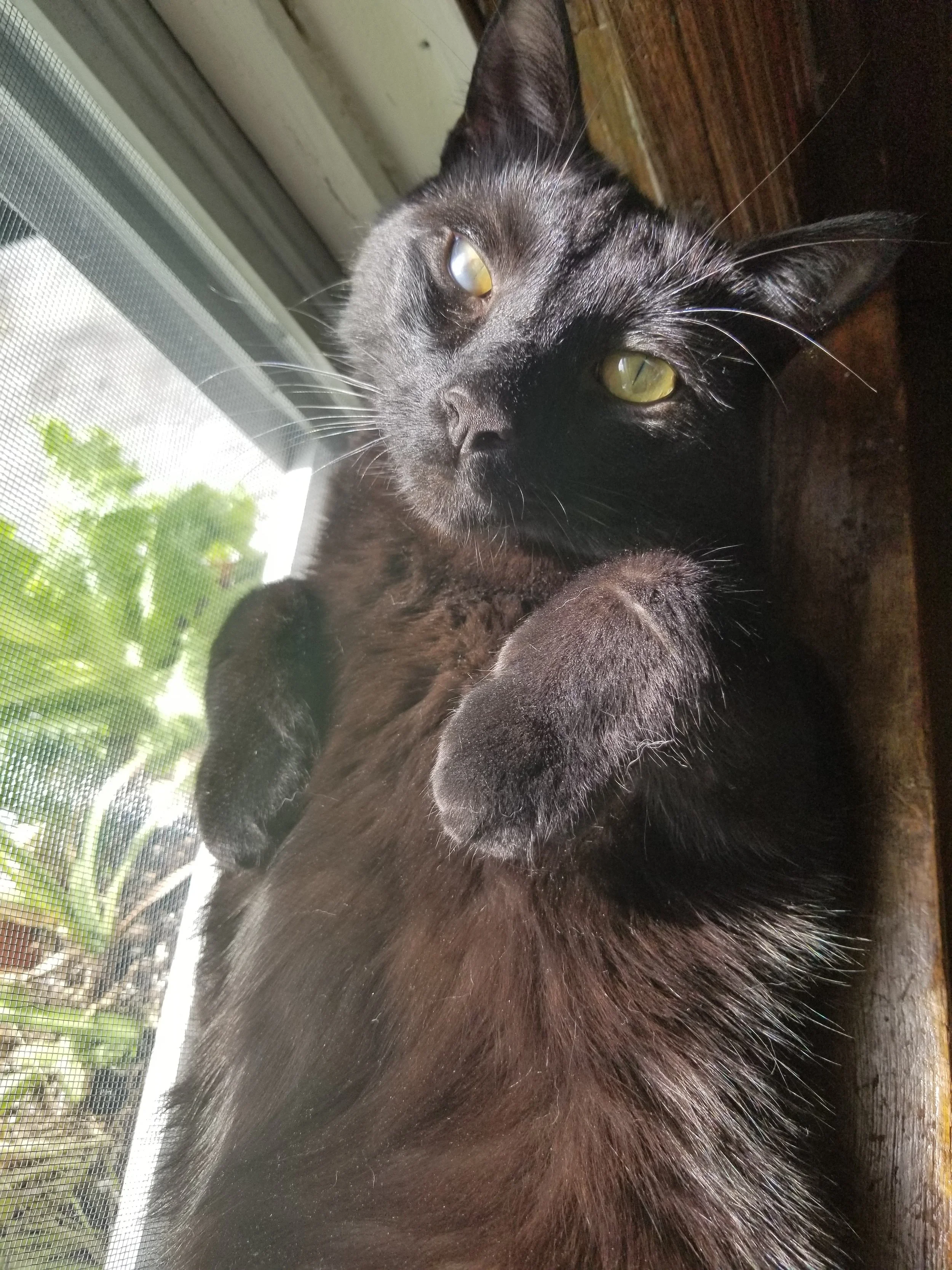 By the time he was three years old, people coming into our apartment or even just standing on the other side of the door would be greeted by hissing and growling. If they entered, they’d be promptly met with claws and teeth. Over the next few years, it just got worse. He became a real danger to anybody but myself and my partner. It wasn’t like his aggression just occurred when people took the initiative to bother him. He’d seek them out, get in their face, stare them down nose-to-nose, then strike. He meant blood. Very occasionally he’d even turn his claws or teeth on me.